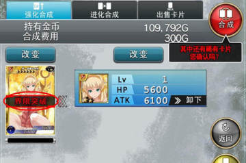 界限突破,其实也是强化合成,只不过是一种特殊的强化合成:需要突破的卡片作为基本卡片,同种卡片作为素材卡片,进行强化合成。举个例子,常见的五星卡“支援型黄蝶”,等级上限是35级,当玩家将它升到35级之后,需要另外刷一张“支援型黄蝶”,用来做素材卡片,对35级的卡“支援型黄蝶”进行界限突破。
