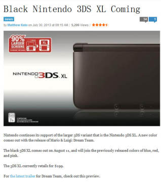 任天堂宣布黑色版3DS XL将于2013年8月11日发售