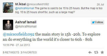 在国外的推特平台上,有不少玩家都会向制作人询问游戏相关信息,制作人也乐意与玩家互动。最近《刺客信条4黑旗》的游戏总监Ashraf Ismail就在推特上回答了粉丝们的问题,并透露新作单机游戏时间长达15至25小时,如果要探索全部内容的话,估计要到60至80个小时。