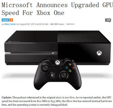 次世代游戏主机PS4和XBOX ONE将于2013年末发售,索尼和微软也在暗中较劲,根据国外游戏媒体gameinformer的报道,微软XBOX ONE主机GPU频率从800MHz提升至853MHz,游戏画质将会更加强劲。目前该主机已经进入了内部硬件测试期,操作系统也正在逐步改进之中。