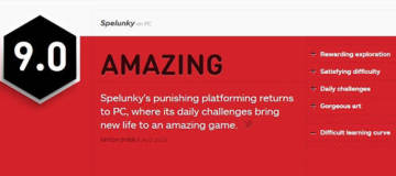 2D横版冒险游戏《洞穴探险》近期登陆PC平台,国外评测媒体IGN自然要对其进行详细评测,最后给予其9.0分的高评价,高度赞扬了此作是PC上久违的对玩家不留情面的过关游戏,它的每日挑战让这款游戏长生不老,下面就来看看其详细评测吧。