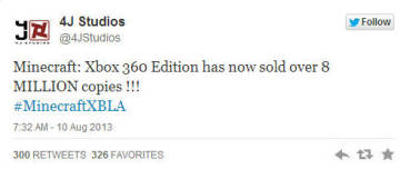 根据《我的世界(Minecraft)》开发商4J Studios官方推特的爆料,该作XBOX360版本目前的销量已经超过800万套,实在是可喜可贺。这个游戏的精髓在于能让每一个玩家在三维空间中自由地创造和破坏不同种类的方块,以便于创造精妙绝伦的建筑物,创造物和艺术品。