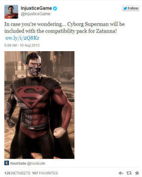 机械超人参战《不义联盟 人间之神》新DLC情报 来源: 飞翔小编feichenpan 2013/8/12 10:15:03 浏览量:1164 《不义联盟 人间之神》是由DC动漫改编的暴力格斗游戏,该作在发售后推出了大量DLC内容,其中将包含令人眼花缭乱的服装以及追加新角色,根据不义联盟官方推特的新情报,机械超人(Cyborg Superman)将包含在新DLC角色扎塔娜中,各位DC动漫的爱好者不要错过了。不义联盟官方推特截图: