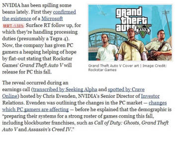 估计他这番话只是一时口误,想当然以为主机版秋季上市所以想当然地以为PC版也同步发行,《侠盗猎车手5》PC版一定会有,但没人知道它的发布日期。除非NVIDIA已经以某种方式成为该作PC版的赞助商,否则它不会知道有关该作的任何细节。