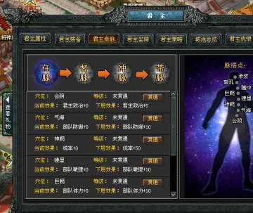 君主将开启四道奇脉,每条奇脉中又分为数量不等的穴位,激活穴位可以获得对应的部队防御,攻击,体力,幸运,诅咒等属性的加成。激活奇脉需要的经络点,玩家们可以在“古迹争夺战”中获得。