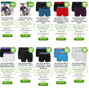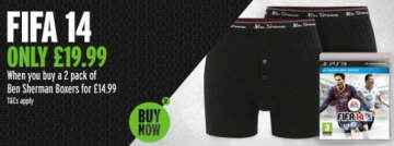 根据产品页面信息显示,目前PS3/Xbox 360版本的《FIFA 14》预购价为42.98英镑(约合410元人民币),但如果消费者愿意在订购游戏的同时再为自己选购两条价值14.99英镑(约合142元人民币)的Ben Sherman男士平角内裤的话,那么就可以19.99英镑(约合190元人民币)的优惠价格获得《FIFA 14》。