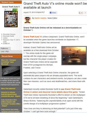 近日国外著名游戏网站gamespot报道了《侠盗猎车手5(Grand Theft Auto 5)》多人模式的相关情报,据悉该作多人模式Grand Theft Auto Online将作为免费DLC预定于今年10月1日提供给玩家下载。游戏中多人模式和单人模式会有部分交汇,但多人模式的自创角色不能在单人模式使用。多人模式有独有的人物和事件设定,玩家能自己创建一些任务,比如赛车和对战,然后分享给其他玩家。