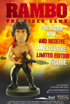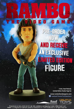 预定《第一滴血》游戏版 免费获得Q版兰博玩偶 来源: 飞翔小编feichenpan 2013/8/18 11:15:06 浏览量:469 电影改编的游戏《第一滴血》预定于2013年冬季发售上市,登陆PC,PS3和XBOX360平台,根据英国发行商Reef的消息,提前预定游戏的玩家将免费获得两款限量版兰博玩偶。该玩偶高3英寸,以Q版的造型还原了兰博在电影里的经典持枪场面,特别是手持RPG的兰博屌爆了。兰博玩偶实物图: 游戏封面: