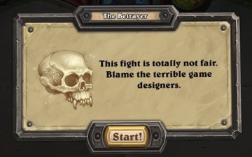 对有经验的卡牌玩家来说,一路还算轻松惬意,直到教学关关底——对战伊利丹。见到蛋总前游戏会提示你:“这就是一场毫无公平可言的战斗,要吐的话,就吐游戏设计师一脸吧!”很好,其实这就是“亲爱的玩家我是您爹”的某种变体对吧。