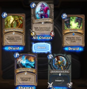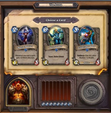 竞技场的组牌与你的牌库完全无关,每次在所有牌表中随机出三张让玩家挑选,有些像实体TCG中的现开赛。组好套牌之后开始对战,三振出局,计算总用场的奖励。