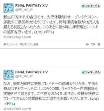 Square Enix的网游大作《最终幻想14重生国度》现今正在火爆公测中,在8月17日至8月19日期间,玩家可以在PC或是PS3主机上体验该作的魅力。根据SE官方推特的消息,在这次的公测游戏体验阶段中,同时在线人数超过了15万人,于是在日本时间的18日下午6点后追加了3个新地图领域以回馈玩家的热情。