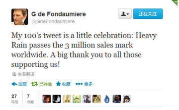 Quantic Dream工作室首席执行官Guillaume de Fondaumiere最近在自己的推特上表示PS3独占游戏《暴雨》销量正式突破300万这一里程碑,该作是2010年2月发售的,时隔3年多终于300万,对于一款独占游戏而言已属不易。