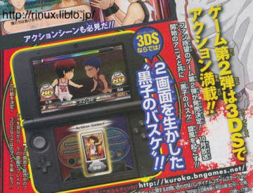 动漫新番《黑子的篮球 第二季》即将于今年10月开播,其配套游戏《黑子的篮球 胜利之路》也将同期登陆3DS掌机平台,根据最新一期游戏杂志的情报,该作的实机画面首次披露。据悉3DS掌机上屏将显示比赛状况,下屏显示玩家的行动,游戏人物都以Q版造型登场,十分可爱。