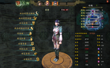 这 里介绍一下必要的条件:这是容霜妹子正常游戏到最终boss前的属性图:武器可以在殷军军营买到,强化到神兵就行了,也不怎么费:正常攻击力在5900 多,这次为了极限点,我把加武肌属性的药都给她吃了,并把她的七轮升到5级加了力量,最终面板6400攻击。(其实没必要)