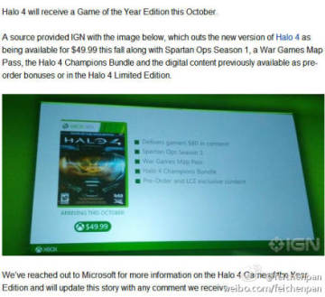 《光环4年度版》将于2013年10月发售上市 来源: 飞翔小编feichenpan 2013/8/27 22:56:52 浏览量:392 根据国外游戏媒体IGN的最新情报显示,微软官方将于2013年10月推出《光环4年度版》,其中将收录斯巴达行动第一季,多人模式对战地图,锦标赛套装,限定版预定数字特典等DLC追加内容,之前还没有购买《光环4》的玩家可以入手游戏了,这些价值80美元左右的DLC内容保证能让你感到物超所值。