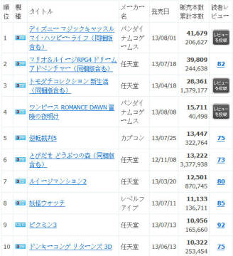 任天堂3DS掌机游戏称霸 占据日本游戏销量排行榜前十 来源: 飞翔小编 2013/8/28 11:29:23 浏览量:716 根据2013年8月12日至8月18日统计的日本游戏销量排行,任天堂3DS掌机游戏牢牢占据着前十位排名,看来3DS不愧是现今销量最火的掌机,旗下游戏层出不穷,并且长卖热卖的游戏很多。排行第一的是《迪斯尼魔法城堡》,其销量已经累计20.6万套,紧随其后的是《马里奥和路易RPG4》,累计销量24.4万套,获得第三名的是《朋友聚会 新生活》,其累计销量已达137.9万套。日本游戏销量排行前十位: