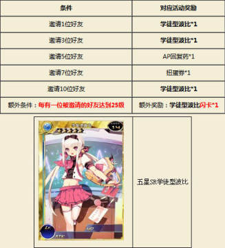 用户B活动期间邀请了11位好友,并且1位好友在活动期间达到了25级,除邀请10位好友的活动奖励“学徒型波比*3、AP回复药*1、扭蛋券*1“外,还将获得额外奖励”学徒型波比闪卡*1“。