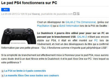 根据外媒游戏网站jeuxvideo的情报显示,游戏开发者目前拿到的PS4手柄可以直接运用到PC平台。将PS4手柄直接连上PC,无需其他驱动,可以直接被认定出来。若是索尼不做调整的话,说不定以后PS4手柄将和XBOX ONE手柄一样作为PC游戏的标准手柄。