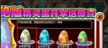 赛尔号白色精灵蛋获取方法 来源: 飞翔小编 2013/9/10 8:47:55 浏览量:815 《赛尔号》这款游戏受到不少小朋友的喜爱,最近又推出了“绝版精灵蛋送惊喜”活动,参加活动的同学有机会获取白色精灵蛋。下面是详细介绍。赛尔号白色精灵蛋怎么得?赛尔号白色精灵蛋是参加9月6日-9月17日“绝版精灵蛋送惊喜”活动获得的物品。在活动期间,成功捕捉任意星球的野生精灵,有机会获得白色精灵蛋。赛尔号白色精灵蛋有什么用?白色精灵蛋有机会孵化出以下几种稀有精灵:布洛克、科尔斯、拉丁、迪布恩、古夫曼、闪光皮皮。在活动页面,从右边选择白色精灵蛋,开始孵化~