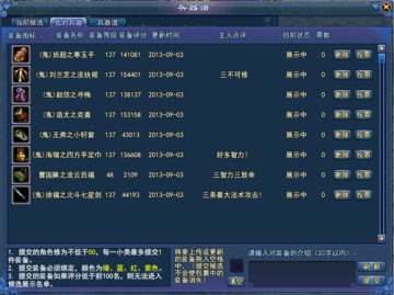 5. 当已提交的装备数值变化时,重新提交同一件装备可以更新其在排行榜上的属性,无需再次花费银两(银票)。提交过后,玩家可以在同一个页面查看自己提交的装备。
