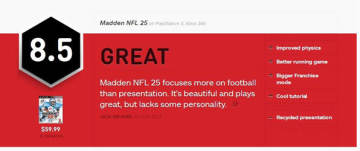 对于美国游戏玩家而言,最喜欢的体育游戏既不是《FIFA》,也不是《实况足球》,而是《麦登橄榄球》,该系列最新作品《麦登橄榄球25》现已登陆PS3和XBOX360平台,国外评测媒体IGN对该作也是赞不绝口,给予其8.5分的评价,下面就来看看IGN的详细评测吧。
