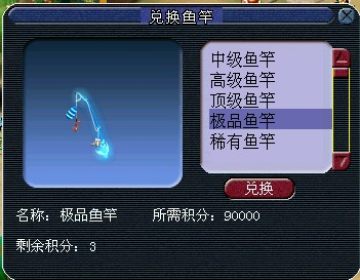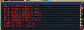 积分在“捕鱼人”处换取经验奖励、储备金奖励、物品奖励,兑换钓鱼法宝、称谓、华丽的鱼竿等。