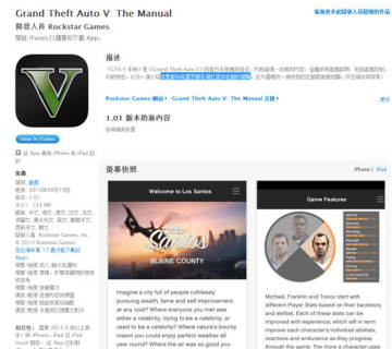 在《侠盗猎车手GTA5》上市发售期间,RockStar官方在苹果iOS平台推出了一款名为《侠盗猎车手5手册(Grand Theft Auto V: The Manual)》的免费应用软件,其中包含超过100多页内容,涵盖所有游戏说明,包括游戏控制,功能特色等。