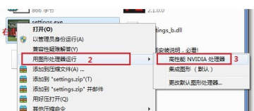 首先我们右击settings.exe文件,然后按下图顺序,点击“高性能NVIDIA处理器”,然后就作出相对应的游戏设置。