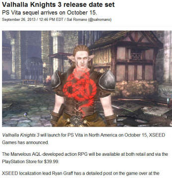 根据国外游戏网站gematsu的消息显示,PSV掌机游戏《瓦尔哈拉骑士3》美版将于2013年10月15日发售,并且同时发售实体卡带版和数字下载版,其售价均为39.99美元。