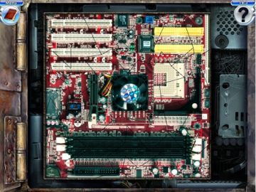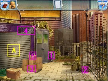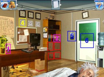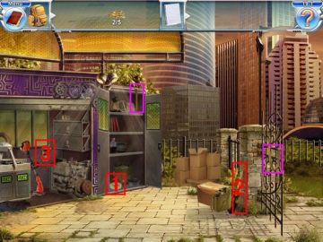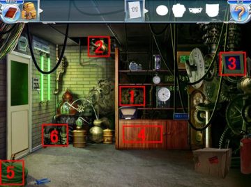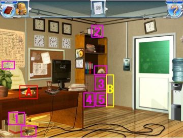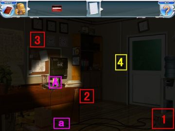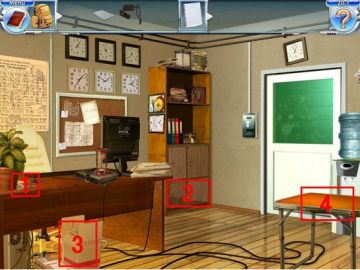 图二中,1处的钥匙打开2处的柜门,找到笔记本电池。点3处箱子后面的光盘,光盘会自动跑到桌子上,再桌子上点它打开得到光盘,但是光盘不能放进包里。东西都找齐了,按下面的顺序把物品放在4处,笔记本,电池,电源,然后点一下电脑,提示需要放入光盘,再把桌上的光盘放入,开始游戏。图二: