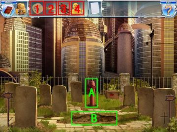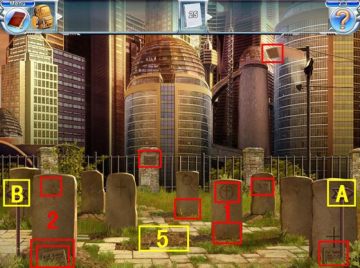 图一中有11个。在1处墓碑移开后下面有一个,后面草堆里还有一个。2处墓碑前面有一个,移开墓碑后下面有一个,后面柱子上还有一个。还记得上面图2.1中的铲子吗,从左边B口回去,拿了铲子挖5处,得到第11个石牌。图一: