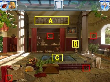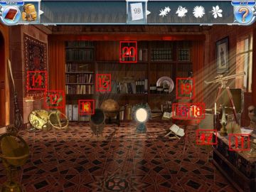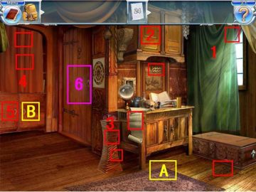 7-3、帮助教授在他的记忆里找到引起他恐惧症的原因。还是找物品啦,按顺序在图上标记出了,其中1处就是第一个物品那本书,图形不过是竖过来而已。4处是铁锚在螃蟹的下面,而物品8就是4处的那个水桶。9处是地球仪,10处海星在地球仪下面,。A处得到钥匙打开12处,得到大脑。17、18分别是铃铛和卷轴都在同一个柜子里,19是眼镜。得到前19个物品后,拿B处的撬棍打开20处的柜子,最后两个物品都在20处。图7.5