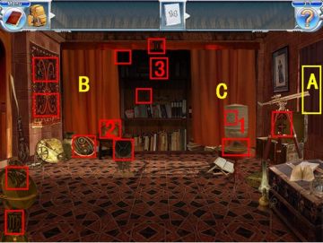 图二中的房间有14个。先把A处的窗帘打开,才能照亮后面的书架。B和C处的帘子都打开。把1处移开后下面有一个,帘子打开的后面还有一个。2处地球仪移走,帘子后面有一个。3处有本紫色的书,移走后有一个,其他的都在图上标记出了。图二: