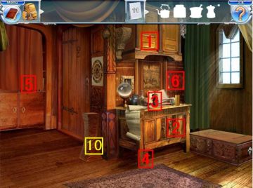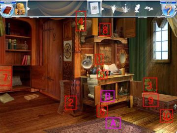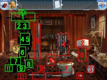 3-4、找东西~先在图一的1处柜子里拿走前面挡着的杂物得到物品,2处打开柜子获得物品,5处拉开帘子得到红花,得到这6个物品后去图二。然后得到7、8、9再回到图一,找到10蓝色的花瓶。最后回到图二,在11处中间的书移走得到最后一个物品。图一: