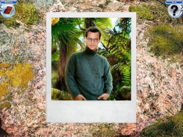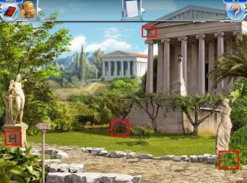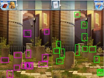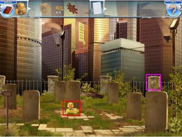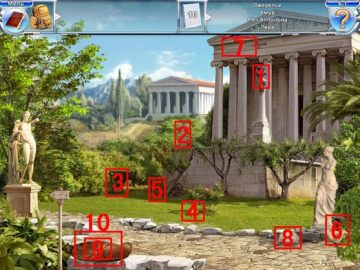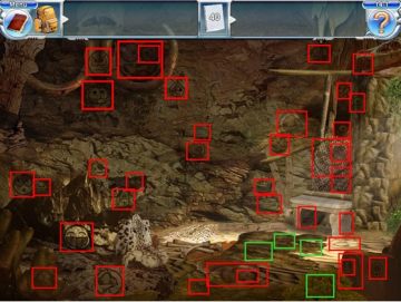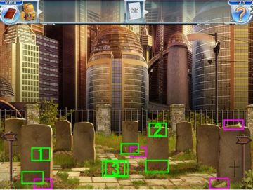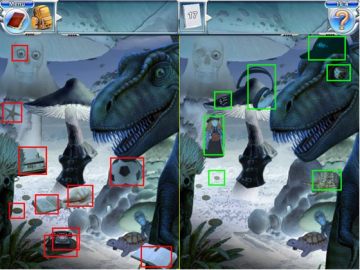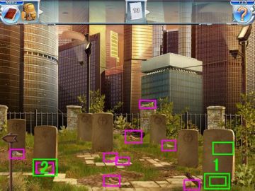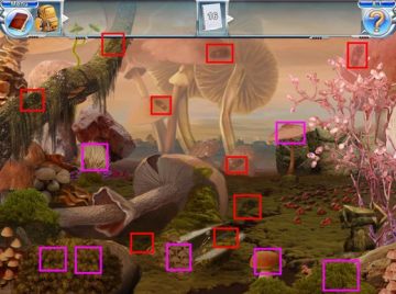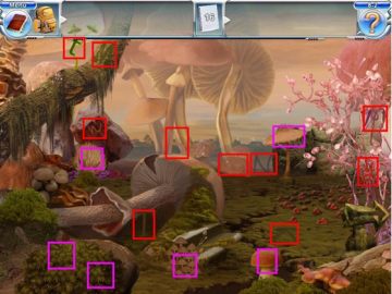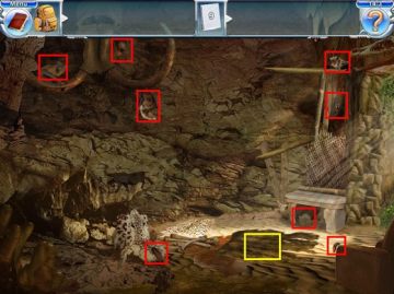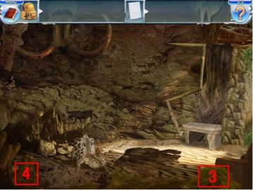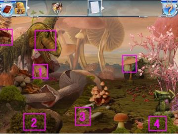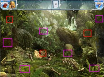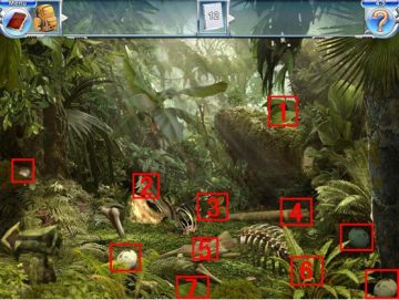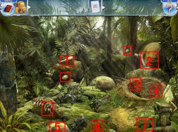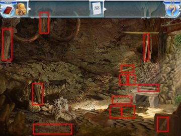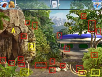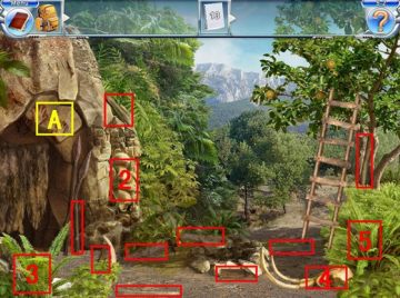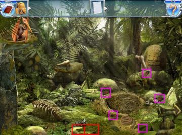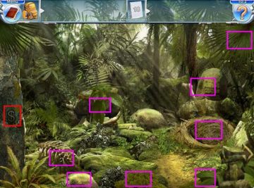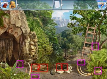 13-5、帮助原始人找到他散落的项链。项链是用骨头、牙齿之类的物品做的,在图上紫色表示在表面上的,绿色框内是被物品挡着的。基本上和前面找石牌差不多,图一中1处隐藏在石碑后面,2处在石碑后面的草丛里。而3处有两个,老样子,去左边地图拿铲子挖,连铲子都是在同一个地方的,注意左边图中铲子下面还有一个。图一中包括铲子挖的总共11个,加上左边图铲子下面的一个共12个,收集完然后去右边的图。图一: