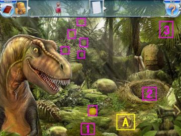 4-2、帮恐龙做饮料。红色的药水只要让它喝了,才能进行语言交流。先找水果,需要18个水果,1、2、3处都是需要移开物品才能得到水果。图一共有9个水果,然后去图二取9个水果,18个收集齐了后,拿水果点红色的药水,变成红色的水果。回图一给恐龙吃。在这两个图里,黄色框内A和B处的绳子下面要用到,一会别忘了回来取绳子。图一: