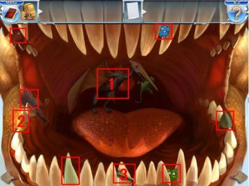 4-3、帮助恐龙清理牙齿,汗。还记得上面图中的两个绳子吗,点右下角的箭头可以从恐龙嘴里出来,拿到绳子再回到恐龙嘴里。先把1处的翼龙赶走,然后用A处得到的长点的那个绳子把2处的金牙拔掉。然后开始组装“牙刷”,3处的骨头放在舌头上,4处得到草刷放在骨头上,最后用短的绳子捆上,做成临时的刷子。最后把细菌都赶走~图上都圈出了,有的细菌在牙后面。图4.4