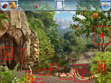 先造梯子,主要是收集木材啦,需要9个木材造梯子。1、2、3处木材都被挡住了,移开物品才找的到。找齐木材后,把梯子放在4处得到苹果,对苹果使用一下红色药水,然后从5处进山洞。进山洞后在右上角有皮毛的地方,原始人就躲在那里,把苹果给他就可以交流了~图5.1