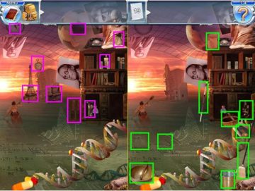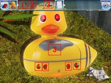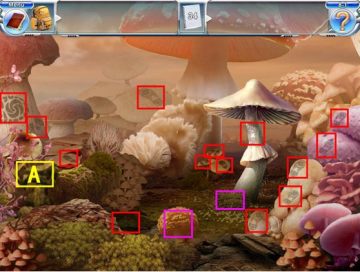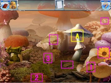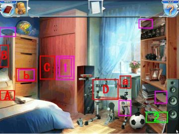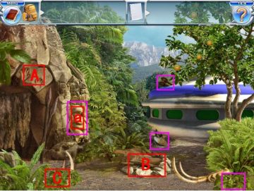 14-3、突然一个太空人降落,这剧情也太恶搞了。帮他收集动物和昆虫。图一上共有22个,黄色的框内是隐藏在物品后面的,其中A处是个机关,打开后在a处得到一只小虫,收集够22个再去下个图。图一: