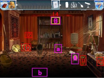 在这个房间里,下面是黑的看不到东西,先把A处的镜子放在a处就可以看到下面啦。然后把B处得到东西放在b处毯子下面,B处暗阁打开,但是要先拿了10、11、12、13这四个物品,其中12是在帘子后面的。最后再去B处拿物最后一个物品14。图11.2