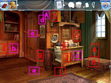 11-1、找东西~6处的骷髅头一开始就可以点的,我找到的比较晚,呵呵。A处的挂饰点一下,会掉落在地上a处得到钥匙。用钥匙打开b处的门,又得到一把钥匙(这么麻烦干什么嘛~),最后打开3处的门得到梳子。得到5处的镜子后面也有一把钥匙,打开c处的柜子又得到一把钥匙,真是复杂,用这把钥匙打开7处得到羽毛笔墨和另一把钥匙,晕了~。这把钥匙用来开8处的箱子,得到物品和撬棍。d处是个机关,点了之后9处才会移动得到物品。收集完这9样物品后用撬棍打开e处的门去另一个房间。图11.1