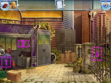 19-1、找到水来终止炸弹。在图一中,1处是消防栓,但是缺少管子,这个图上紫色框内有水管的两个部分,2处还是老样子,要去左边的图找到铲子挖坑。然后去左边的图。图一: