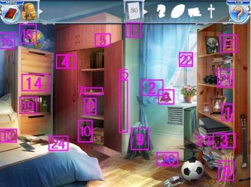 13-4、找到TOM小时候的物品。先把鼓架和音箱都移走,4处是十字架,在柜子里的第一层;5处是数字“2”;7处是手表;8处是望远镜在布后面;9处是台灯在布后面;11处是字母“t”;12处是数字“5”在雕像后面;13处是手铐在枕头下面;15处是尺子;16处是蝙蝠;19处是剪刀在书后面;23处是螺丝刀,在3处下面。图13.5