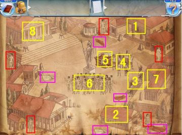 15-2、为雅典人民争取民主,因为统治阶级暴政,把仓库装满武器,却要把人们的衣服烧掉。先在图上红色框和紫色框内收集5件衣服和5个人,然后给得到的人群穿上衣服,把穿好衣服的人群放在1处银行。得到一箱钱,把钱放在2处的酒坊,得到两桶酒。用酒灌醉3和4处的守卫,再拿5处的衣服给6处人群穿上。把6处穿好衣服人群放在7处仓库,获得武器。再把拿着武器的人群放在8处讨伐暴君(暴君竟然就3008年的那个机器人,搞笑~)。然后把先前的5个人放在8处建立新的政权,得一箱钱,把钱放进1处的银行。现在把3和4处的守卫唤醒,拿守卫放在皇宫前的人群处,解除人们的武装,维护新的政权。最后点击解除了武装的人们,完成任务。图15.3