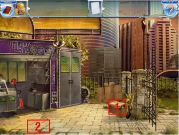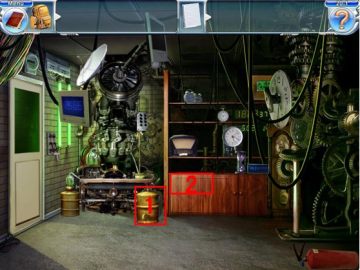 17-1、太空人突然到来,并留下了一个定时炸弹~炸弹竟然是只小玩具鸭子。这次的任务是解除炸弹~先点两下向左箭头来到图一,在1处箱子后面得到一个工具箱,它自动移到2处,打开工具箱得到两把螺丝刀,一个锤子,一个钢丝钳。图一: