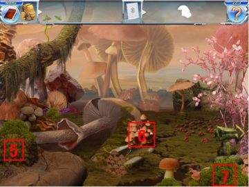 左边的这张图上也有7处。在1处后面是TOM;2处草丛后面是小时候的TOM;3处蘑菇后面是苏格拉底,光屁股的大叔,嘿嘿;4处草丛后面是机器人。找齐14个人物后,把拼好的真相回到右边的图给蘑菇,任务就完成了。图22.3