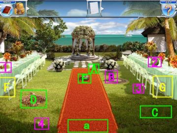 23-1、没想到粗心的教授把结婚戒指弄丢了,先找到结婚戒指。先把A处的枕头点一下,它就会自动放在a处,这里是用来放戒指的。然后在1处得到苹果和葡萄,2处的西瓜落在地上,在西瓜后面得到猕猴桃,地上的3处得到一片西瓜,最后在4处得到梨。因为一次只能拿4个东西,所以把除苹果外的水果得到一个就喂给B处的鸟,给它梨、西瓜、猕猴桃、葡萄之后,它才想起来还要苹果,再给它苹果,然后它就分走了,露出了井盖。在C处草丛后面得到撬棍,撬开B处小鸟下面的井盖,得到铲子,再拿铲子铲D处的土,露出D处的井盖,再用撬棍,找到一只老鼠。拿老鼠放在E处的猫那里,猫身子下面得到一枚戒指,放在a处。另一枚戒指就简单多了,F和G处移走椅子,掀开桌布,F处有只猴子拿着戒指,G处是香蕉,拿所有的香蕉喂猴子,得到第二枚戒指,两个戒指都放在a处后过关。图23.1