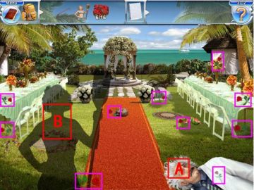 在是教授的大脑里,点中间A处划船的小人,他划出去一半就被UFO困住了。然后在1处柜子里找到一把枪和一个回力标。然后在2处找到钥匙打开3处的门,3和4处里面各有一个玻璃瓶,用背包里的撬棍打碎它们,得到子弹和一个硬币。5处的柜子里得到火药。把火药和子弹装填在枪上,就会向UFO发枪,但是打飞了…再把硬币放在船尾下面的位置,推动划船的小人前进,这个时候,6处就会出现教授夫人的模型,得到后才可以开始收集玫瑰,以赶走UFO。紫色框内是玫瑰,B处教授画像是出口,不过先在这个图上收集够6个玫瑰再离开。图23.2