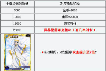 淘气的小御坂妹妹偷走了茵蒂克丝的别针!亚瑟们快帮茵蒂克丝找回来吧!活动期间,在游戏内探索学园都市活动秘境,以及击败秘境强敌,都可获得“小御坂妹妹”。每集齐25000个“小御坂妹妹”即可获得5星异界型茵蒂克丝*1(有几率获得闪卡)。