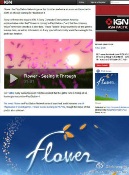 索尼官方近日对国外游戏媒体IGN透露,PS3时期的经典独立游戏《花(Flower)》将高清重制,登陆索尼次世代主机PS4平台。据悉《花》的PS4版本将会以1080P的超高清画面,采用60HZ稳定运行,保证让大家重温经典之作。有关该作更详细的消息将会在晚些时候公布,请各位玩家耐心等待。